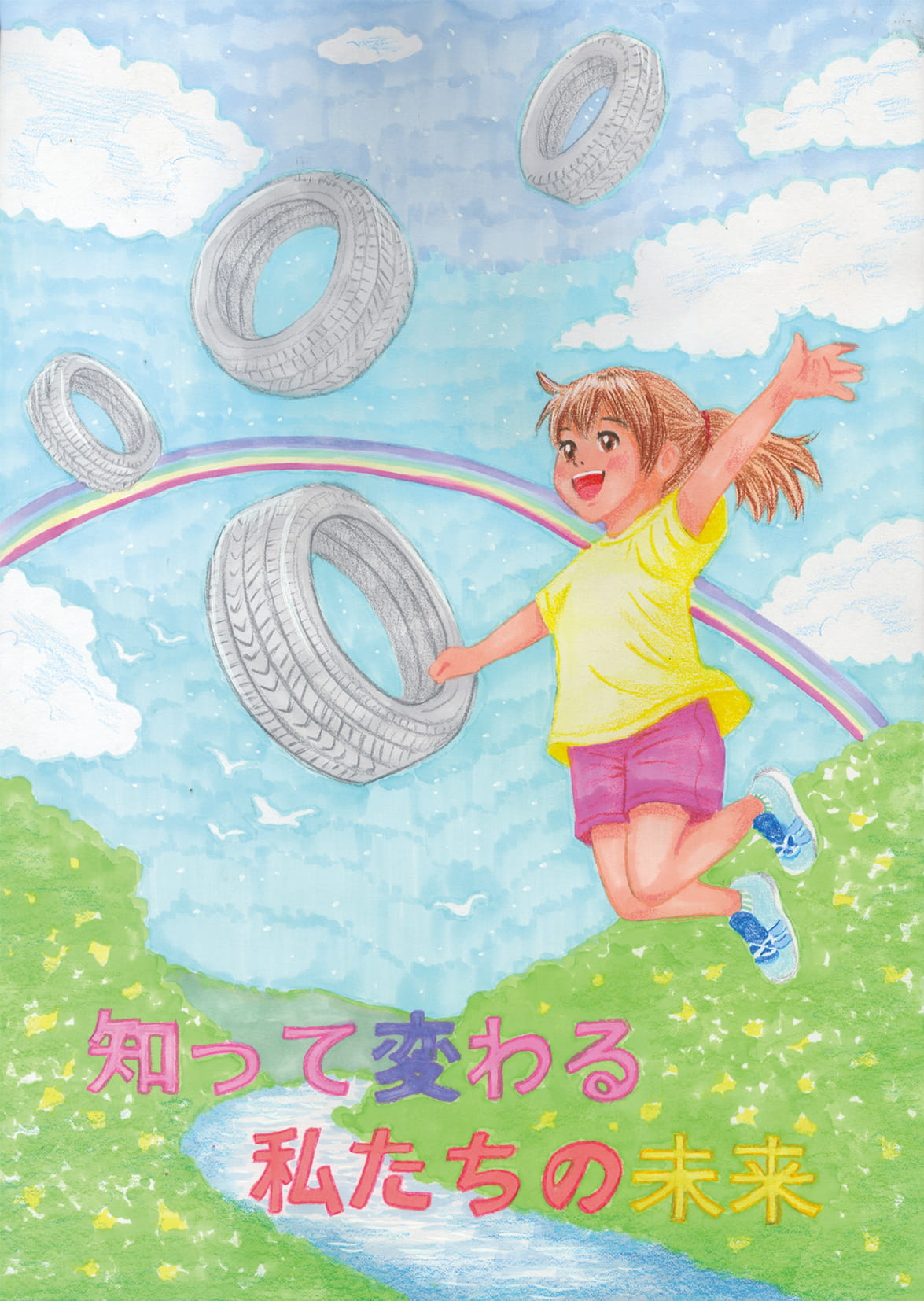 車の部品がリサイクルされ、形を変えて役立ち続けることを知り、身近な世界の見え方が変わりました。知ることは考えや行動を変える一歩です。その前向きな気持ちを、空へ跳ぶ姿で表しました。
