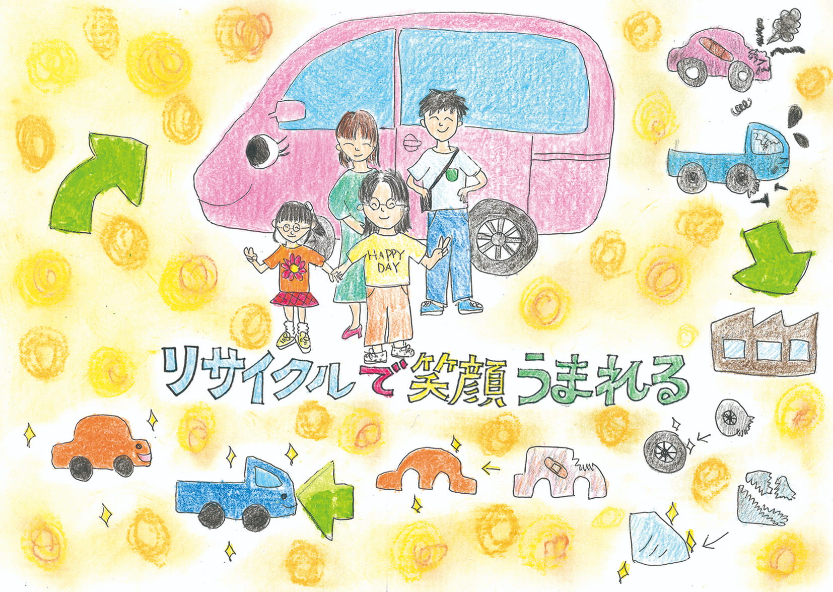 こわれてしまった車もリサイクルしてピカピカきれいになってよかったです。家族で新しい車を買いに行って、うれしいようすを絵にしました。