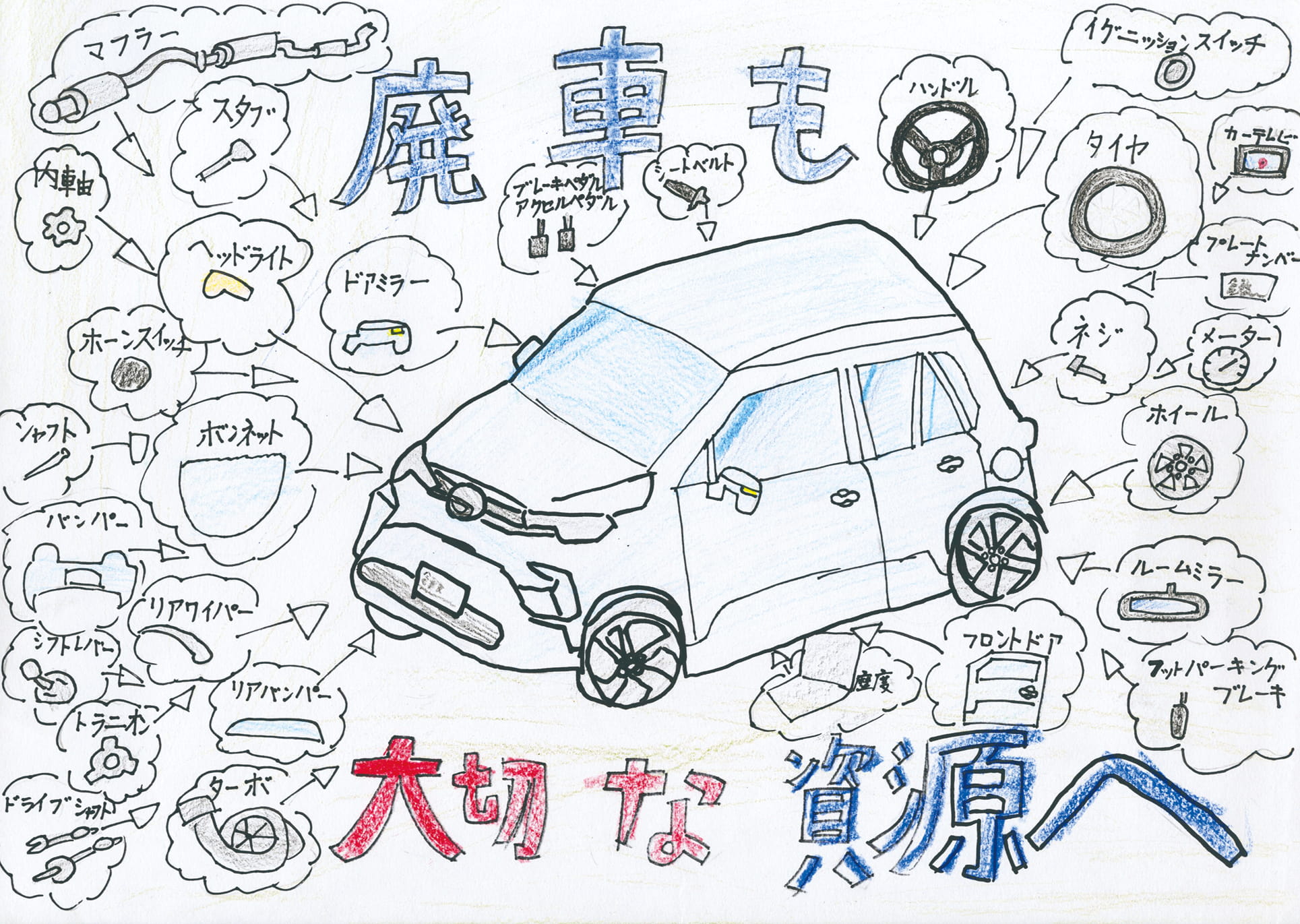 車からはこんなに沢山の部品が出て、リサイクルすると、また新しい車ができたり、資源になるから、リサイクルしようという気持ちを込めました。