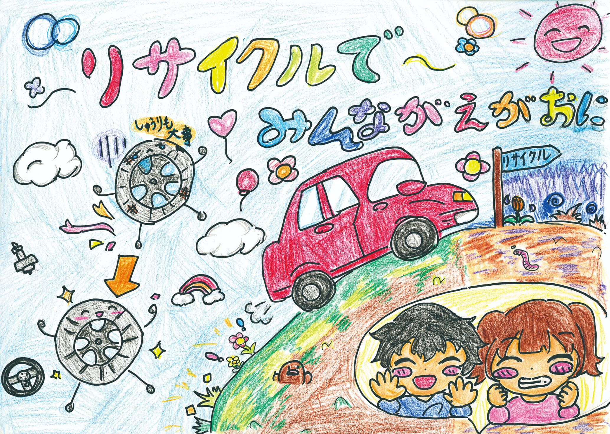 リサイクルを通じて、未来が明るくなればいいな。と思いながらかいた。車のリサイクルで、かんきょうにもやさしくなればいいなと思って、ポスターの絵で表現した。