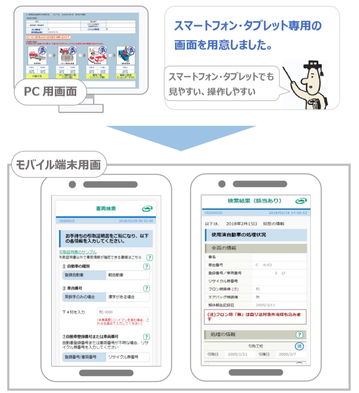 公益財団法人自動車リサイクル促進センター(所在地:東京都港区芝大門1-1-30日本自動車会館、代表理事:郡嶌孝 以下、「JARC」)は、操作性と利便性の向上を目指して、スマートフォンやタブレット(以下、「モバイル端末」という)に対応したユーザー向けの情報システム*を、2018年2月26日(月)から提供いたします。